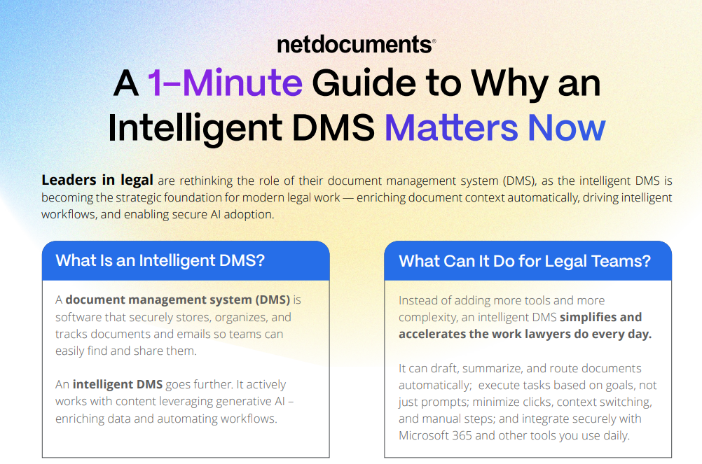 A 1-Minute Guide to Why an Intelligent DMS Matters Now Leaders in legal are rethinking the role of their document management system (DMS), as the intelligent DMS is becoming the strategic foundation for modern legal work — enriching document context automatically, driving intelligentworkflows, and enabling secure AI adoption Complete this…